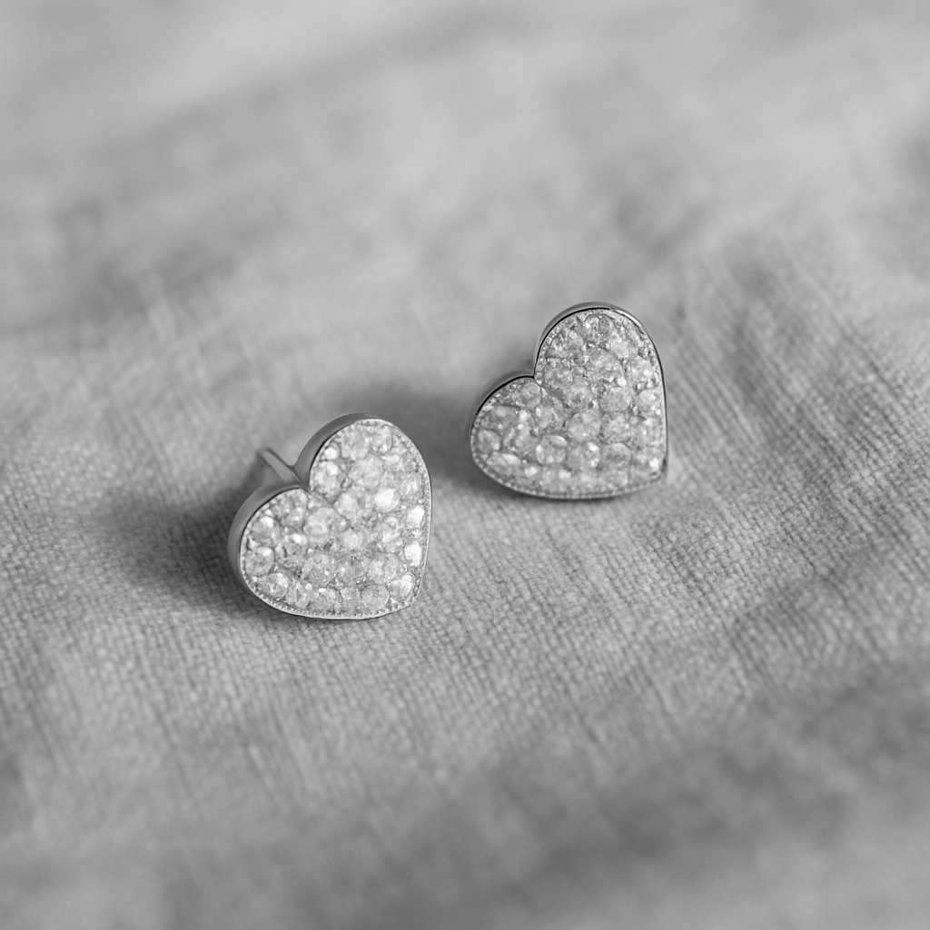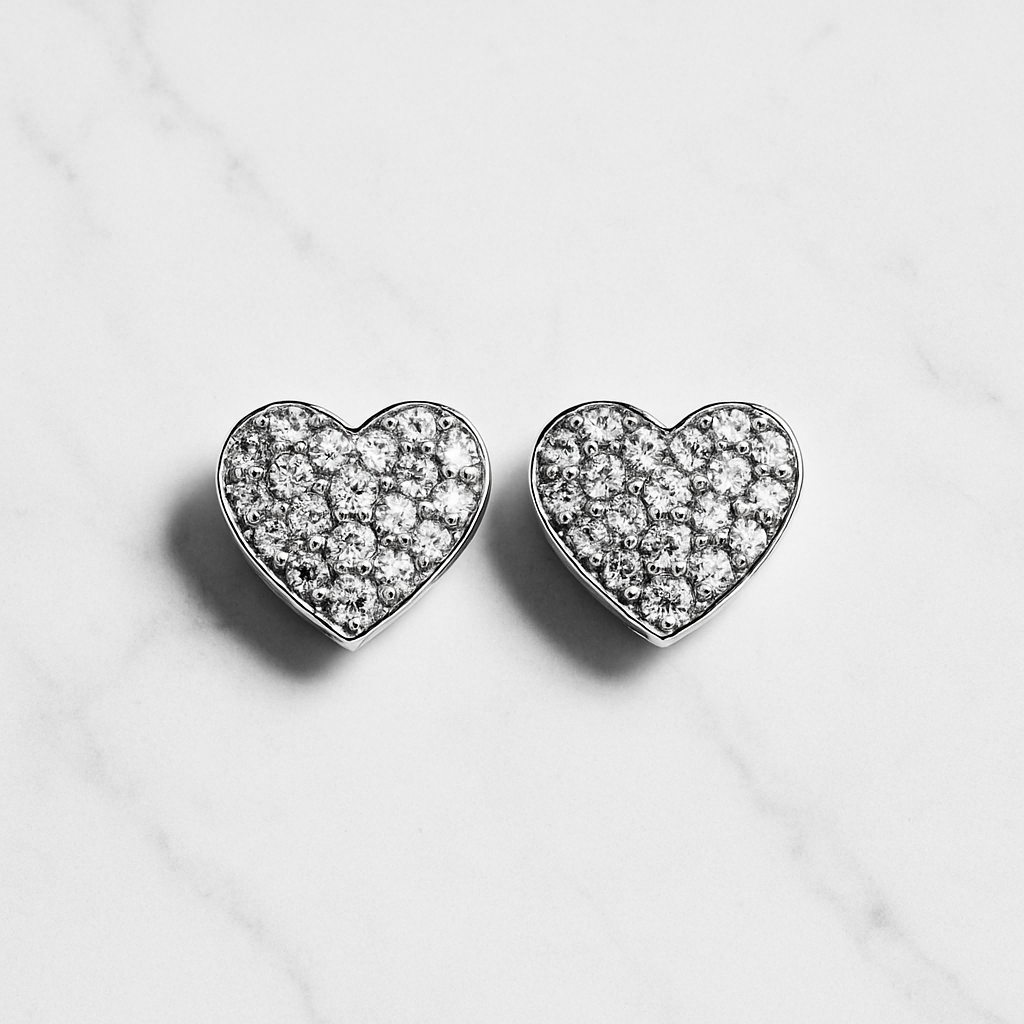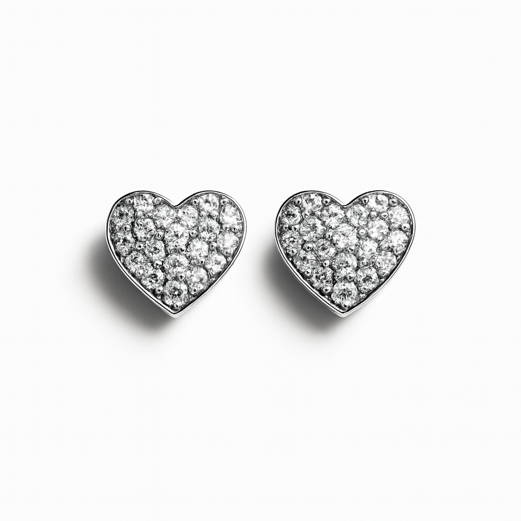 round, brilliant cut vvs moissanite. claw set on a heart stud plated with rhodium or gold.